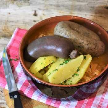 - Heat in the oven and serve with fried potatoes, onions and sauerkraut.